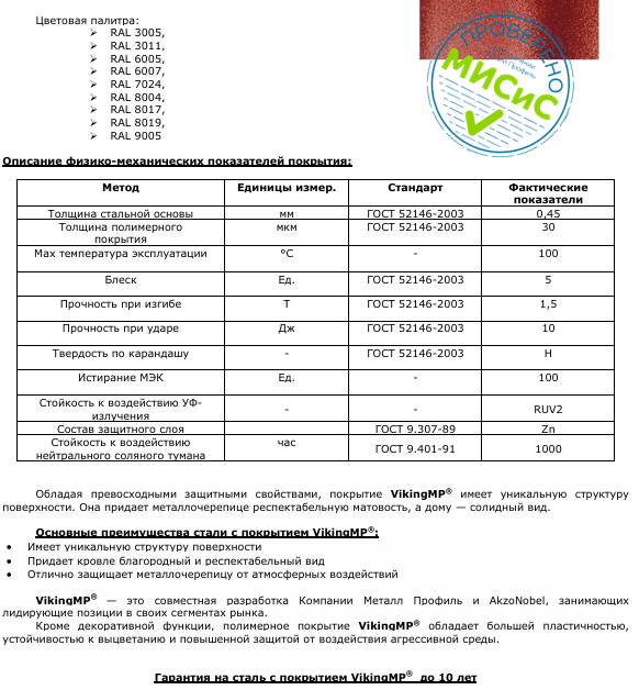 Гарантия долговечности. Завод-изготовитель Металл Профиль предоставляет официальную гарантию на изделия коллекции Viking до 5 лет