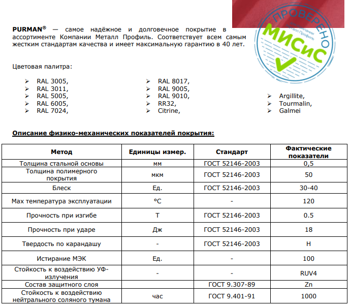 Долговечность. Завод-изготовитель Металл Профиль предоставляет официальную гарантию на отсутствие сквозной коррозии стали с покрытием PURMAN® до 50 лет.