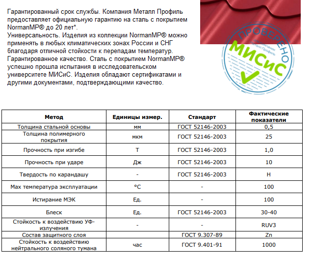 НОРМАН- покрытие полиэстер с высокой степенью защиты от коррозии. Завод-изготовитель МеталлПрофиль. Гарантия 10лет.