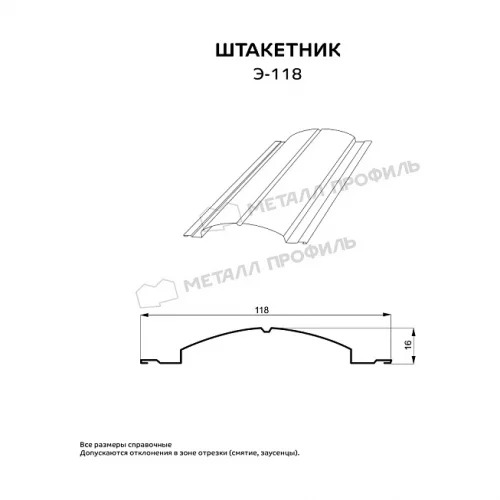 Штакетник Э-118 выполнен в виде полукруга и похож на профиль Ellipse (Эллипс). При этом он отличается более узкой центральной частью и чуть более широкими полями по краям. Также Э-118 жёсткий, прочный и долговечный, его легко монтировать и не нужно обрабатывать защитными средствами. Штакетник Э-118 это полукруглый эллипсовидный штакетник с завальцованными краями. Он имеет канавку посередине, которая усиливает жёсткость штакетника и придаёт ему интересный вид.