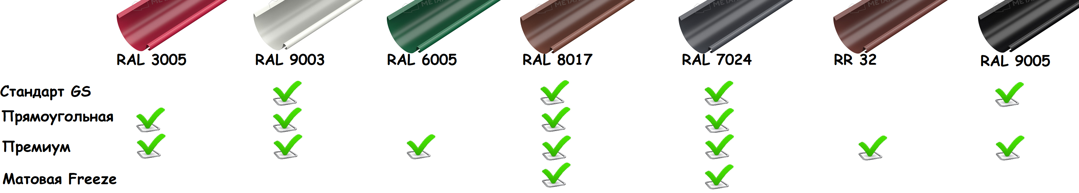 По умолчанию рассчитываем стандартную систему с диаметром желоба 125мм, если Вам нужен больший диаметр желоба (150мм) просим сказать об этом нашему менеджеру, производящему расчет необходимых элементов водосточной системы.